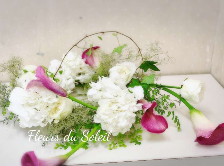 パリスタイル/スモークツリー&カラーで初夏のコンポジション 2025/07/15 今日は晴天! また暑い一日になりそうですっ 今年の異常な暑さに(毎年言ってるけど・・笑) せめて目で涼を感じていただけるようなお花を・・♪ カラー、スモークツリー、アジサイ・・ そして欠かせないのがグリーン!! ん~~なんとも涼しげ♪ ほんの少し・・爽やかな気分になっていただけたかなー