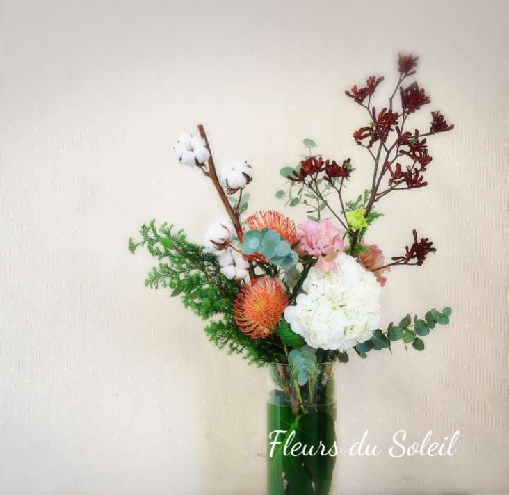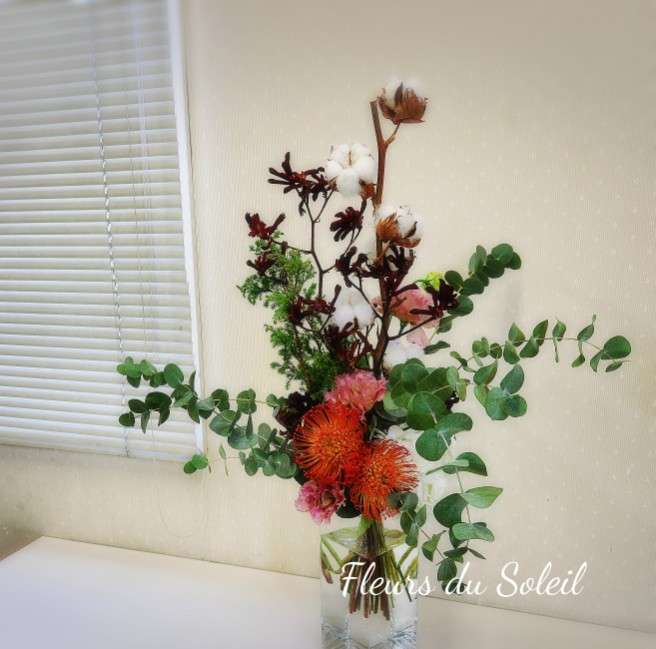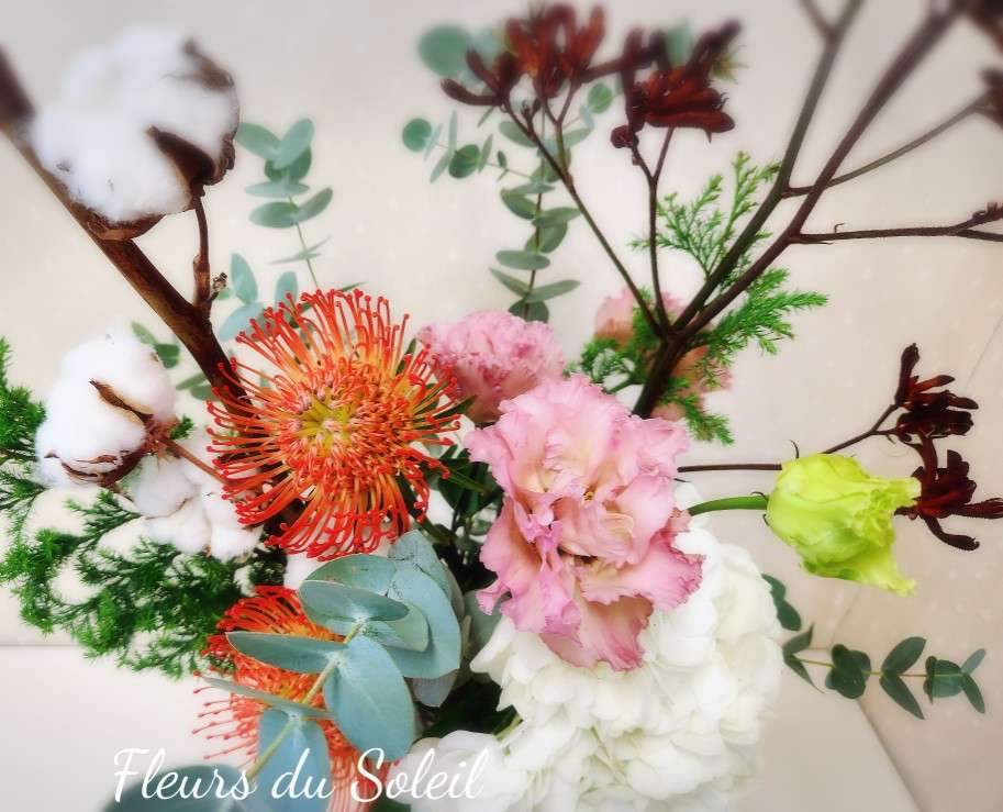 パリスタイル/Christmas Bouquet 2025/12/17 気付けばもう年末間近になりました、、 クリスマスももうすぐですね♪ 先日クリスマスケーキの予約するの忘れててあぶなかったーっ 間に合ってよかった笑 レッスンは冬のレッスンに入っております 先日のパリスタイルのレッスンで制作いただいたのは クリスマスに向けたコットンをつかったブーケ♪ 赤のカンガルーポーとコットンがいい感じ♪ お疲れさまでした~